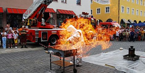 Mit Spiritus den schwächelnden Grill auf Vordermann zu bringen - was jedem privaten Grillmeister streng verboten sein sollte, wurde am Samstag beim Blaulichttag mit Abbsicht gemacht: Und prompt stand der vermeintlich unvorsichtige Bratwürstl-Meister selbst lichterloh in Flammen. Glücklicherweise handelte es sich dabei um einen erfahrenen Feuerwehrmann, der mit entsprechender Schutzkleidung ausgestattet war und so mehrere Minuten Temperaturen bis 1000 Grad aushalten konnte.