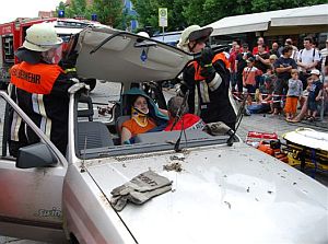 In einem anderen Teil der abgesperrten Marktstraße war extra ein demoliertes Altauto herbeigekarrt worden, mit dem Feuerwehr, Notarzt und Sanitäter einen schweren Verkehrsunfall simulierten. Angenommen werden sollte, daß der Fahrer des Wagens nur leicht verletzt wurde, daß aber die Frau auf dem Beifahrersitz eine Wirbelsäulenverletzungen erlitten hat, die bei der Bergung aus dem Wrack äußerte Vorsicht nötig macht.