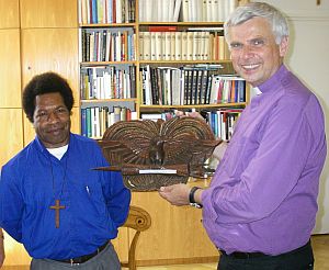 Als Gastgeschenk überreichte Pfarrer Charley Wereka, Rektor der Pastorenausbildungsstätte, dem Landesbischof eine Holzskulptur eines Paradiesvogels, der in der Flagge des Landes als Zeichen der Einheit des Landes darstellt.