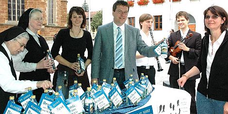 Mit einem Info-Stand und einem Wasser-Geschenk luden die Niederbronner Schwestern und Verwaltungsleiter Gundekar Fürsich am Dienstag zum Brunnenfest am Sonntag ins Kloster ein.