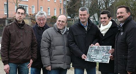 Kämpfen für die "grüne Lunge" im Woffenbacher Schlosspark: CSU-OV-Vorstandsmitglied Stefan Schön, Robert Frank, Vorsitzender des BSC, 2. CSU-OV-Vorsitzender Georg Kohlmann, Naturschutzreferent Stadtrat Werner Thumann, CSU-Ortsvorsitzender Maximilian Federhofer, CSU-Stadtverbandsvorsitzender Helmut Jawurek (von links). Im Hintergrund das BRK-Heim.