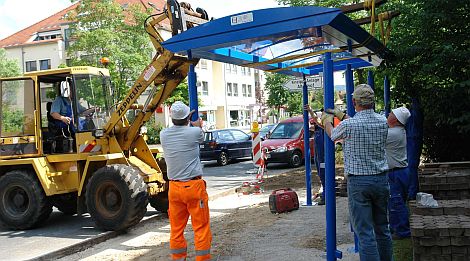 Jetzt begannen die Aufbauarbeiten für das Buswartehäuschen, das insgesamt einschließlich Erdarbeiten, Fundament und Pflasterung rund 10.800 Euro kosten wird.
