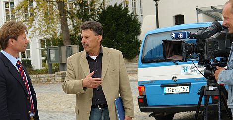 Oberbürgermeister Thomas Thumann im Gespräch mit Autor Engelbert Schwarzenbeck bei den Dreharbeiten im Oktober 2006 in Neumarkt auf dem Residenzplatz