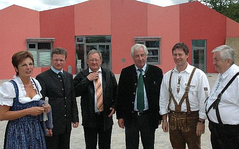 Jugendreferentin Elfriede Meier, MdL Herbert Fischer und Oberbürgermeister Thomas Thumann mit ihren Gästen vor dem Haus der Jugend. Von links: Bernd Siebler, jugendpolitischer Sprecher der CSU im Landtag, Landrat Karl Vogele und MdL Max Strehle.