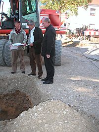 Früher als erwartet werden die Arbeiten für den Stauraumkanal an der Mariahilfstraße abgeschlossen sein. Schon innerhalb der nächsten zwei Wochen sollen die Arbeiten beendet sein. Dies hat Oberbürgermeister Alois Karl bei einem Ortstermin bekannt gegeben. Erst am 29.September waren dort die Arbeiten begonnen worden. Insgesamt wird die Stadt dort 78.000 Euro investieren. Die Asphaltschicht soll bis Ende November, Anfang Dezember aufgebracht sein. Mit dem Bau des Stauraumkanals will die Stadt verhindern, dass es wie in der Vergangenheit immer wieder geschehen bei großen Regenfällen zu Rückstauungen und Überschwemmungen in den umliegenden Straßen kommt. Die Anwohner wurden bereits vorab in einer Bürgerinformation über diese Maßnahme informiert. Darin schreibt Oberbürgermeister Karl: "Wiederholt haben uns Anwohner der Wirsching-, Mariahilf-, Seel-, Brunnleit- und Weiherstraße gemeldet, dass es bei großen Regenereignissen zu Rückstauungen und Überschwemmungen kommt. Wir haben diese Hinweise aufgenommen und im Rahmen der Erstellung des Generalentwässerungsplanes zahlreiche Untersuchungen und Berechnungen durchgeführt. Dabei haben wir unsere Abwasserkanäle mit einer Kamera befahren sowie den bautechnischen und hydraulischen Zustand vom Ingenieurbüro Petter auswerten lassen. Die Ergebnisse haben unsere Vermutungen bestätigt: Das Einzugsgebiet für die Abwasserkanäle ist sehr groß, starke Regenfälle belasten die unten liegenden Bauwerke sehr stark. Gerade bei großen Niederschlagsmengen kommt es immer wieder zu Überlastungen und auch zu Überschwemmungen. Dies resultiert natürlich auch daher, dass in den letzten Jahren immer mehr gebaut worden ist, dass wir eine immer stärkere Versiegelung der Flächen feststellen, ohne dass der Kanalquerschnitt "mitgewachsen" wäre. Wir haben uns daher entschlossen, an verschiedenen Stellen der Stadt die auftretenden Probleme zu beheben und wollen in der Mariahilfstraße zwischen der Friedenstraße und der Fichtenstraße einen neuen Stauraumkanal mit einer Drosselleitung erstellen. Dadurch wird das oft nur sehr kurze Zeit aber sehr intensiv anfallende Regenwasser zurück gehalten und anschließend dosiert in die Kanalleitung eingegeben. Die erforderlichen Arbeiten werden umgehend begonnen und ca. vier Wochen andauern. Störungen des Straßenverkehrs sind unumgänglich - die Mariahilfstraße muss im genannten Bereich gesperrt werden. Ich bin sicher, dass Sie hierfür Verständnis haben insbesondere dann, wenn später eine deutliche Verbesserung der Rückstausituation eintritt. Ich hoffe sehr mit Ihnen, dass diese Maßnahmen