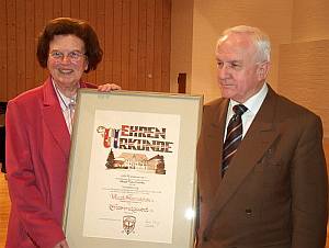 Das "historische Gewissen" wurde Hundert![]() Vorsitzende Anni Lang ernennt ihren Vorgänger im Amt von 1970 bis 1975, Oberbürgermeister a.D. Kurt Romstöck, zum Ehrenmitglied. Foto: Erich Zwick
