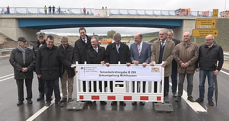 Mit der Verkehrsumlegung auf die neue 5,4 Kilometer lange Strecke wird das Baufeld im Bereich der alten Bundesstraße 299 frei für die Fertigstellung der Anschlussstellen Mühlhausen-Nord und Pollanten bis Ende des Jahres. Im nächsten Jahr wird die Großbaumaßnahme mit dem Bau der Brücken über die Sulz, der Anbindung der alten Bundesstraße bei Reismühle an die neue Ortsumfahrung sowie den auf 10 Hektar vorgesehenen Ausgleichsmaßnahmen endgültig abgeschlossen.