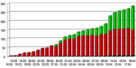 Nach den am Sonntag gemeldeten Angaben sind derzeit aktuell 144 Personen infiziert und 134 gelten als wieder gesund. Die Gesamtzahl der jemals infizierten Fälle - also inklusiv der genesenen, aber auch der acht verstorbenen Menschen - stieg auf 286 an.