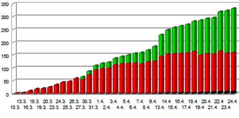Zum Verständnis: die von der Oberkante der grünen Balken gebildete Kurve steigt zwangsläufig immer weiter an (sie kann auch theoretisch niemals fallen). Wichtig ist dagegen die Kurve, die von der Oberkante der roten Balken gebildet wird
