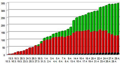 Unsere Grafik zeigt die Zahl der genesenen (grün), der aktuell infizierten (rot) und der verstorbenen Menschen (schwarz).