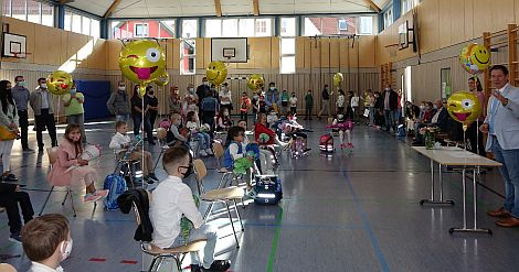 Schulleiterin Tanja Kölbel lud die Kinder ein, sich auf die Schule einzulassen, dann könnten sie jeden Tag ein Abenteuer erleben und Neues entdecken. Die Leiterin der Ganztagesklasse nahm anschließend die neuen Schüler mit ins Klassenzimmer, damit der erste Schultag beginnen konnte.