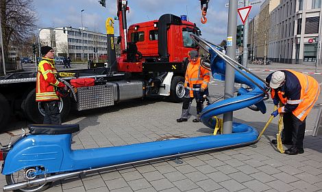 Das Kunstwerk des Lothar Fischer-Preisträgers Stephan Rohrer ist aus seinem Winterquartier zurück. Mithilfe eines Krans wurde der arg verfremdete Motorroller wieder über den Mast einer Straßenlampe am Unteren Tor in Neumarkt gehoben. Dafür hatte zuvor ein Mitarbeiter der Stadtwerke die Sicherung ausgeschaltet und die Stromverbindung entfernt.