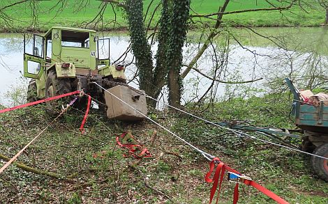 Mit Gurten und Seilen wurde die Zugmaschine am Rand des Altwassers gesichert