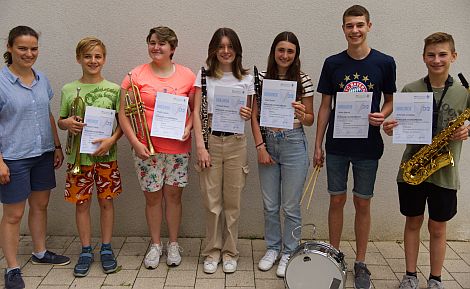 Fridolin Rickauer, Carolin Preißl (beide Trompete), Eileen Wiegard, Emilia Sippl (beide Klarinette), Marcel Marx (Schlagzeug) und Jonathan Schmidt (Saxophon) bestanden die im Schwierigkeitsgrad etwas höher liegende D2-Prüfung bestanden. Hier muss zusätzlich zu Tonleitern und Vortragsstücken auch ein Vom-Blatt-Stück absolviert werden, also Noten, die man vorher noch nicht gesehen und natürlich auch nicht geübt hat.