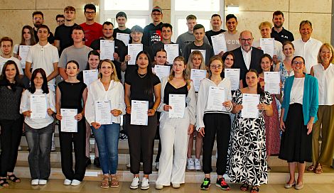 Landrat Willibald Gailler und IHK-Geschäftsstellenleiterin Silke Auer überreichten den Azubis ihre Teilnahmezertifikate. Gailler lobte die Initiative, denn gerade im Landkreis Neumarkt mit seiner niedrigen Arbeitslosenquote sei der Konkurrenzdruck zwischen den Firmen um die Azubi-Akquise hoch, da könne man mit attraktiven Zusatzangeboten punkten. Silke Auer bedankte sich bei den teilnehmenden Firmen, die ihre Auszubildenden für die Workshops freistellten.