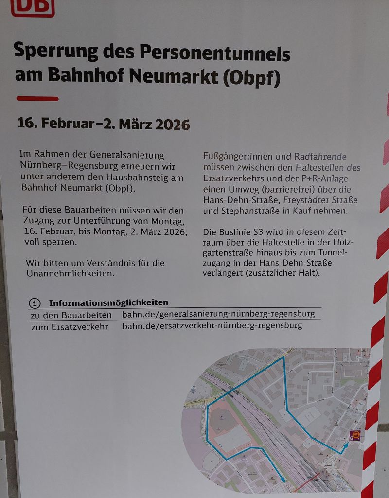 Und jetzt, wenige Tage vor Beginn der Mammut-Bauarbeiten, weist die Bahn ganz nebenbei mit einem kleinen Plakat darauf hin, dass wegen der Erneuerung des Hausbahnhofs in Neumarkt vom 16.Februar bis 2.März der Zugang zur Fußgängerunterführung gesperrt werden muss, in der man vom Großparkplatz an der Hans-Dehn-Straße unter dem Bahngelände hindurch zum Busbahnhof kommen kann.