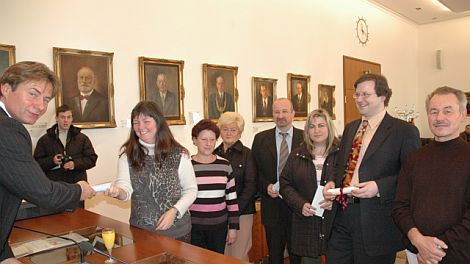 Oberbürgermeister Thomas Thumann überreicht den Gewinnern der Schmankerl-Bons ihre aufgerollten und mit einer Schleife verzierten Gutscheine.