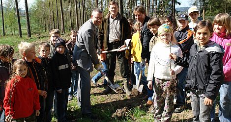 Jetzt war auch Neumarkt dran: Mädchen und Jungen der Grundschule Holzheim pflanzten die letzten von rund 2500 Eichen, Hainbuchen, Rotbuchen, Bergahorn, Tannen und Fichten, die das Unternehmen inklusiv Pflanzung und Schutzzaun zur Verfügung gestellt hat. Mit zum Spaten griffen am Donnerstag auch Oberbürgermeister Thomas Thumann und der Neumarkter Fielmann-Niederlassungsleiter Jürgen Busch.