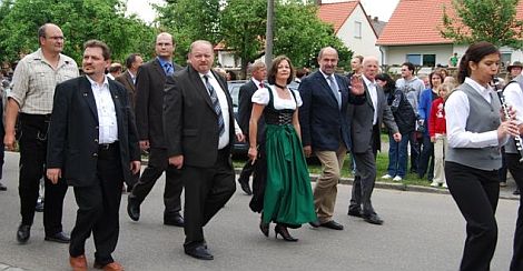 Der umjubelte Festzug wurde angeführt von einem volksfestgelaunten Bürgermeister Willibald Gailler, der sich die Brauerei-Geschäftsführerin Marlies Bernreuther an seine Seite geholt hatte. Hinter beiden schritt Landtagskandidat und CSU-Kreisvorsitzender Albert Füracker. Die Abordnungen von 64 Vereinen folgten ins Festzelt, in dem bis zum "Zapfenstreich" die Blaskapelle Thannhausen unermüdlich aufspielte.