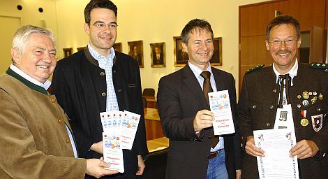 Festreferent Herbert Fischer, Volksfestorganisator Thomas Thumann vom Hauptamt, Oberbürgermeister Thomas Thumann und der 1. Schützenmeister der 1433er, Josef Dietmayr bei der Vorstellung des Volksfestprogramms und des Bürgerschießens.