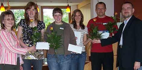 Pflegedienstleiterin Manuela Engelbrecht und Heimleiter Stefan Krusche übergaben im Namen des Diakonischen Werkes an Melanie Hollweck, Stephanie Hilliges, Lilian Dortmann und Thomas Wenzel ein kleines Präsent.
