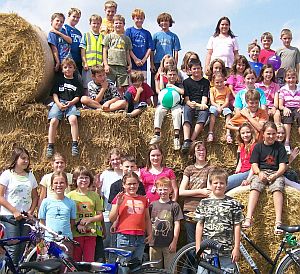 Unter den Besuchern war auch eine Ausflugsgruppe mit 40 Kindern aus Berngau mit ihrem 1. Bürgermeister Wolfgang Wild, die alle mit dem Fahrrad zum Maisfeld gekommen waren. Den Kindern machte das Suchen der Gemeindeschilder und der versteckten Skulpturen des Künstlers Bernhard Kopp genauso viel Spaß, wie das anschließende Klettern und Turnen auf den dafür bereitgestellten Strohballen.