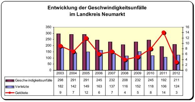 Unfälle mit der Ursache überhöhte oder nicht angepasste Geschwindigkeit stiegen 2012 um 8,7 Prozent von 1315 auf 1430. Demgegenüber blieb die Zahl der Unfälle mit Personenschaden mit 593 nahezu unverändert. Die Zahl der Verkehrstoten verringerte sich signifikant, von 37 auf 21 und damit um 43,2 Prozent. Allerdings stieg die Zahl der verletzten Verkehrsteilnehmer von 854 auf 859.