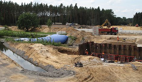 Der Bau für die Kanalbrücke läuft. Links sind die Hydrobaffle zu sehen, die ein Teilstück des Kanals trocken legen