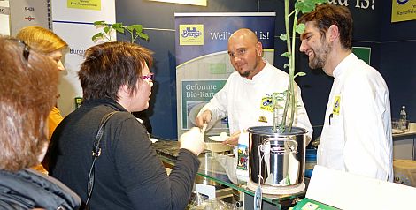 Die vorgeformten Knödel, in zwei unterschiedlichen Größen erhältlich, sind mit dem neuen bayerischen Biosiegel ausgezeichnet. In zwei verschiedenen Varianten – traditionell und vegan – vor Ort von zwei Köchen frisch zubereitet, fanden sie bei den Fachbesuchern großen Anklang.