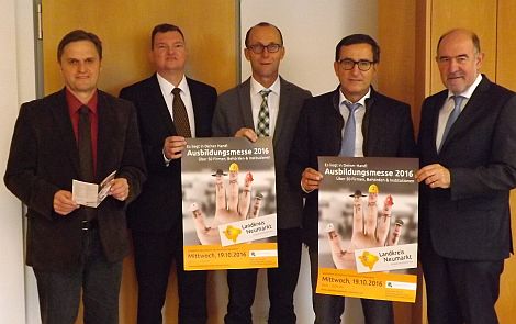 NEUMARKT. Nach der sehr großen Resonanz in den vergangenen Jahren wird auch heuer wieder eine Ausbildungsmesse im Landkreis Neumarkt veranstaltet, so Landrat Willibald Gailler zusammen mit Wirtschaftsreferent Michael Gottschalk, den Wirtschaftsförderern Michael Endres und Bernd Hofmann sowie Albert Hierl, dem Leiter der Berufsschule Neumarkt bei der Programmvorstellung der Ausbildungsmesse 2016.
