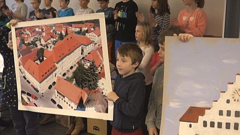 Nach einem Musikstück begrüßte3 Oberbürgermeeister Thomas Thumann die Gäste und ging auf die Geschichte der Schule ein. Informationen zum Bau gab vor der Schlüsselübergabe Architekt Wolfgang knychalle. Danach nahmen Geistliche der beiden Konfessionen diee kirchliche Segnung vor.