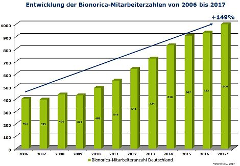 Waren im Jahr 2006 noch 401 Mitarbeiter für das Unternehmen in Deutschland tätig, nahm die Belegschaft innerhalb von zehn Jahren prozentual um 149 Prozent zu. „Wir heißen Marco Sikora stellvertretend für alle neuen Mitarbeiter herzlich willkommen“, so Prof. Michael A. Popp, Vorstandsvorsitzender und Inhaber der Bionorica in Neumarkt. Mit dem 1.000. Mitarbeiter in Deutschland habe man einen weiteren Meilenstein beim Ausbau des Unternehmens erreicht. Man sei auf Fachkräfte wie Marco Sikora angewiesen und freue sich sehr, "dass er nun auch Teil der Bionorica-Familie ist“.