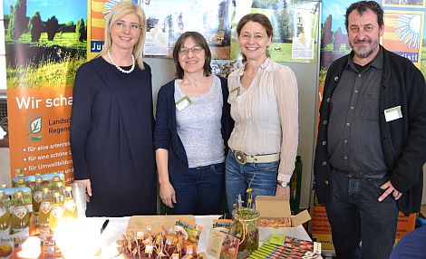 Ministerin Ulrike Scharf am Juradistl-Stand mit den Vertretern der Landschaftspflegeverbände