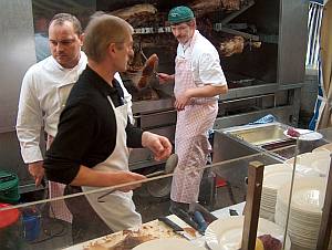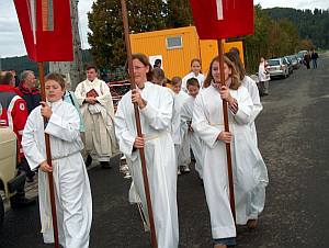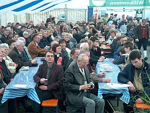 Pöllinger Ortsumgehung - ein "Jahrhundertwerk"NEUMARKT-PÖLLING. Pölling hat ein "Jahrhundertbauwerk" und seinen ersten Ehrenbürger. Mit dem Titel darf sich künftig Oberbürgermeister Alois Karl schmücken.![]() Das Festzelt war sowohl beim Gottesdienst wie auch bei der welt- lichen Feier voll besetzt. Das "Nun danket alle Gott" am Schluß des von Pfarrer Albert Ott im Festzelt zelebrierten Jubel-Gottesdienstes war mehr als ein Lippenbekenntnis. Es war ein Lobpreis auf alle, die an dem "Jahrhundertwerk" mitgewirkt haben. ![]() Der "heimliche Bürgermeister von Pölling" hat soeben Ober- bürgermeister Alois Karl zum "Ehrenbürger von Pölling ernannt. Mit ihm freuen sich Grundstücksbesitzer, die als erste den Weg für die neue Trasse freimachten. Sie erhielten einen mit persön- lichen Daten versehenen Erinnerungsteller. Fotos: Erich Zwick Im besinnlichen Teil des freudigen Bürgerfestes ließ Oberbürgermeister Alois Karl das zähe, jahrzehntelange Ringen um die Umgehungsstraße Revue passieren, ehe der appetitlich duftende Ochs am Spieß die illustre Versammlung zum Mittagsmahl bat. Pölling sei schon immer ein wichtiger Verkehrspunkt gewesen, holte Alois Karl bis ins Jahr 1896 aus, als damals am 1. Mai morgens um 5.30 Uhr der erste Zug im "Bahnhof Pölling" auf seiner Jungfernfahrt stoppte. ![]() Ministranten begleiten Pfarrer Albert Ott von der Kirche zum Festzelt. Diese Unfälle und der rapide zunehmende Verkehr inspirierten zur Verlegung der Ortsdurchfahrt, doch alle Pläne verschwanden immer wieder in der Schublade, obwohl sich - besonders in der scharfen Kurve bei der Bäckerei Feihl - immer wieder schwere Unfälle ereigneten. So in den Siebziger Jahren mit vier jungen Leuten, die nicht überlebten, als deren Pkw gegen einen Peitschenmasten krachte. Mit der Eröffnung der Autobahn Nürnberg - Regensburg im Jahre 1971 erhoffte man sich eine Entspannung für Pölling. Das Gegenteil trat aber ein: Wurden im Jahre 1970 "nur" 5.057 täglich gezählt, waren es 15 Jahre später schon 10.151 und 2002 gar 15.400. Innerhalb von 32 Jahren hat sich der Verkehr mehr als verdreifacht. Hätte man jetzt nicht gegengesteuert, hätte es im Jahre 2015 - so die Prognose - 19.400 Fahrzeuge gegeben. ![]() Eine Attraktionen beim Pöllinger Bürgerfest: die Ochsenbraterei. Am 15. Oktober rollten die schweren Baumaschinen der Firma Max Bögl an und mit ihnen - wie das Stadtoberhaupt besonders lobend hervorhob - fleißige und tüchtige Mitarbeiter, die er mehrmals mit einer Brotzeit belohnte und sicherlich auch anspornte. So konnte fast auf den Tag genau die neue Umgehung fertiggestellt werden. Als Nachfolgearbeiten bleiben noch für die Jahre 2005/06 die Anbindung Pöllings mit einer Überführung der B 8 und die Anbindung Holzheims (Beckenhofer Weg). Das "Jahrhundertwerk" hatte aber auch seinen Preis: 15 Millonen Euro, wovon dank der Einschaltung der Abgeordneten Hans Spitzner und Herbert Fischer eine Zuschußsumme von 10,5 Millionen Euro locker gemacht werden konnten. "Die 4,5 Millionen Eigenanteil der Stadt sind uns unsere Pöllinger Bürger wert", rief Alois Karl unter dem tosenden Applaus der Angesprochenen. Die feierten dann ausgiebig auf ihrer neuen Straße mit Inline-Skate-Rennen, Blasmusik, Luftballonwettbewerb, Schauübungen der Feuerwehr und Rettungssanitäter, einer Seitenwagenvorführung von Baptist Kohlmann und einer Pflanzaktion - "jeder Pöllinger Verein setzt ein Bäumchen" -, Kletterwand, Kinderschminken und Glücksrad. Ehe aber die neue Umgehung ihrer eigentlichen Bestimmung übergeben wird, müssen sich die Pöllinger und alle anderen Verkehrsteilnehmer noch eine Woche gedulden. Am Montag, 25. Oktober, durchschneidet der Bayerische Staatsminister des Innern, Dr. Günther Beckstein, das symbolische Band, und erst dann kann der Verkehr auf neuer Route rollen. Erich Zwick
