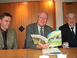 Ein "Pfüat Gott" und ein "Welcome"![]() Regierungspräsident Dr. Wilhelm Weidinger (Mitte) blättert in der Info-Mappe über den Landkreis Neumarkt, die ihm Albert Löh- ner als Orientierungshilfe für seine Freizeit-Aktivitäten überreichte. Michael Gottschalk (links) empfahl dem Ruheständler in spe den "Schlachtschüsselführer". Foto: Erich Zwick Am Ende seiner fünfeinhalbjährigen Amtszeit als Regierungspräsident der Oberpfalz sagte Dr. Wilhelm Weidinger Landrat Albert Löhner stellvertretend für alle Neumarkter "Pfüat Gott". Ein "Welcome" schlug kurz darauf dem "Direktor of Government Relation aus Grafenwöhr, James P. Federline, der auch für die Standorte Hohenfels und Vilseck der "100th Area Support Group" der amerikanischen Streitkräfte zuständig ist, entgegen. Als "wichtigen Helfer und Freund" bezeichnete Landrat Albert Löhner den in gelöster Atmosphäre zur gemütlichen Kaffeestunde nach Neumarkt gekommenen Regierungspräsidenten. Beide erinnerten sie an die gemeinsam gelösten Aufgaben der Vergangenheit, wobei der "Beinahe-Pensionär" der Kreisverwaltung überschwängliches Lob zollte, da der Landkreis Neumarkt der mit der zweitniedrigsten Verschuldung in ganz Bayern sei. "Neumarkt ist in vielen Punkten gut aufgestellt", hob der Regensburger Gast hervor, wobei er die Agenda-Bewegung "Spitze" nannte. Obendrein komme dem Kreis Neumarkt seine Schlüsselstellung zwischen den bayerischen Großstädten Nürnberg und Regensburg zugute. Während die Wirtschaft in Nürnberg kranke, was an der hohen Arbeitslosenzahl abzulesen sei, könnte jetzt Regensburg mit seinen Pfunden wuchern - und Neumarkt sich dorthin orientieren, wo gerade die Sonne scheint. Nachdem das Vertrauen der Bevölkerung in die große Politik an einem Tiefpunkt angelangt sei, müssten jetzt die Kommunen und Landkreise die Dinge von unten her in die Hand nehmen. Damit meinte der Kreischef aber nicht die Broschüren über den Landkreis Neumarkt - der Leiter der Abteilung Kreisentwicklung, Michael Gottschalk, empfahl da besonders den "Schlachtschüsselführer" -, die er Regierungspräsident Weidinger zusammen mit einem persönlichen Erinnerungsgeschenk in die Hand drückte, sondern das Aufbrechen der Verdrossenheit vieler enttäuschter Bürger. ![]() Landrat Albert Löhner heißt Director James P. Federline als Ver- bindungsmann für Hohenfels im Landkreis willkommen. Foto: Erich Zwick