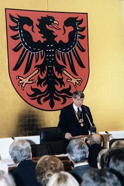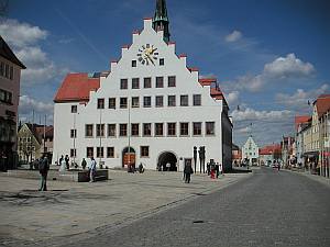 Mit diesen Worten hatte Oberbürgermeister Alois Karl am 8.12.1999 bei der Einweihung des Rathauses I die Absicht der Stadt auf einen Nenner gebracht. Zuvor war das Rathaus in einem wahren "Par force-Ritt" innerhalb von acht Monaten für rund 10,7 Millionen Mark umgebaut und von oben bis unten durchsaniert worden. Besonders erfreute Oberbürgermeister Karl, dass die wichtigsten Bauleistungen unter der Leitung des Architekturbüros Berschneider und Knychalla fast ausschließlich von örtlichen Betrieben erbracht worden sind. Vor allem im Hinblick auf die gestiegenen Einwohnerzahlen und die hinzugekommenen Aufgaben war das im Jahr 1957, übrigens ebenfalls am 8. Dezember, nach dem Wiederaufbau eingeweihte Rathaus nicht mehr zeitgemäß. Auch hinsichtlich der Haustechnik und vor allem in Anbetracht der Tatsache, dass es in den 50er Jahren mit sparsamen Mitteln und einfachen Baustoffen aufgebaut worden war, musste eine grundlegende Sanierung ins Auge gefasst werden. "Das Rathaus, also die zentrale Verwaltung, gehören in den Kern einer mittelalterlichen Stadt", erinnert sich Oberbürgermeister Karl an die Entscheidung, statt eines Neubaus an anderer Stelle das bestehende Rathaus zu erweitern und zu sanieren. Zudem besitzt das Neumarkter Rathaus eine über 600 Jahre alte Geschichte. Und nicht umsonst liegt es im Kreuzungspunkt der Altstadtachsen und nimmt so städtebaulich eine Sonderstellung in der Altstadt ein. Zusammen mit der Pfarrkirche St. Johannes, der Hofkirche und dem Schlossbereich stellt es ein wichtiges Element des historischen Ensembles der Neumarkter Altstadt dar. "Ich bin froh, dass die Verantwortlichen der Stadt unter dem damaligen Oberbürgermeister Theo Betz in den 40er und 50er Jahren diese Bedeutung des Rathauses erkannt und an einem Wiederaufbau festgehalten haben." Nachdem das Rathaus bei den verheerenden Angriffen im April 1945, gerade einmal zwei Wochen vor Kriegsende, völlig zerstört worden war, stand es mehr als zehn Jahre als Ruine im Mittelpunkt des Marktplatzes. Schon im Juli 1945 hatte die amerikanische Militärregierung die Sprengung der Rathausruine gefordert. Dies konnte jedoch glücklicherweise verhindert werden. Schon beim Volksfestumzug 1954 hatte das Stadtbauamt einen Wagen geschmückt, auf dem ein Modell des wieder aufgebauten Rathauses präsentiert wurde. Darauf war zu lesen "Wie es einmal war und wie es werden sollte". Die endgültige Entscheidung für den Wiederaufbau fiel in der öffentlichen Stadtratsitzung am 7.7.1955. Bis auf drei Gegenstimmen entschieden sich alle Stadträte für den Wiederaufbau des Rathauses am angestammten Ort. Bereits 1946 hatte der Stadtrat den Architekten Hanns Meier mit der Vorplanung betraut. Dieser Entwurf wurde letztendlich mit dem Baubeginn im Oktober 1955 nahezu unverändert ausgeführt. Bei der Einweihung am 08. Dezember 1957 nannte es der damalige bayerische Staatsminister für Wirtschaft und Verkehr, Dr. Otto Schedl, "ein Symbol des zähen Willens zur Selbstbehauptung der Bürger". Zugleich sei es ein stolzer Abschluss des rasanten Neumarkter Wiederaufbaus.