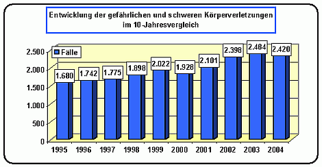 Auch wenn im Jahr 2004 durch den Anstieg um 0,4 Prozent die Zahl der Straftaten mit 116.376 den bisherigen Höchststand von 1998 mit 115.953 Fällen überschritten hat, so ist doch ein positives Resümee zu ziehen. Gerade in Deliktsbereichen, die das Sicherheitsgefühl der Bürger besonders beeinträchtigen, konnte ein Rückgang verzeichnet werden. Und insgesamt ist die Kriminalitätsbelastung gemessen an der Häufigkeitszahl, also bezogen auf die Zahl der Einwohner, in Ostbayern im bayerischen Vergleich am geringsten.