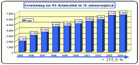 Bei der Entwicklung der Rauschgiftkriminalität setzte sich der kontinuierliche Anstieg der letzten Jahre fort. Gegenüber dem Vorjahr ist eine Steigerung um 88 Delikte (+ 1,3 Prozent) zu verzeichnen, so dass 6.806 Fälle für das Jahr 2004 registriert wurden. Diese Steigerung ist – vor allem im Vergleich zu den Erhöhungen der Fallzahlen der letzten Jahre, sehr moderat ausgefallen.