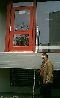 Wegen der Einrichtung des Park-Cafes im Untergeschoß haben sich neue Feuerschutz-Bestimmungen ergeben, die die Notausgangs-Tür in der Bücherei notwendig machten. Die Tür wurde auch prompt eingebaut - doch unmittelbar dahinter kann höchstens ein einziger Mensch stehen. Von einer Treppe oder Leiter auf den 1,85 Meter tiefer liegenden Boden keine Spur.