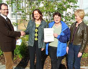 Der Geschäftsführer der Caritas-Sozialstation Richard Theil und Pflegedienstleiterin Sieglinde Diepold gratulieren Gisela Stagat und Monika Rupp zu ihrer erfolgreichen Prüfung in gerontopsychiatrischer Pflege an der Katholischen Akademie für Berufe im Gesundheits- und Sozialwesen.