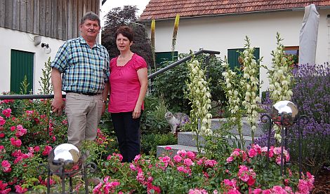 Ideen für die Pflanzgemeinschaften holt sich Renate Amler in anderen Gärten oder auch in Zeitschriften und Katalogen. Für sie ist auch die Versorgung mit frischem Gemüse und Obst ein Anliegen. Deshalb sticht ein Gemüsegarten gleich am Eingang zum Grundstück in die Augen. Hier werden mit Unterstützung der Oma alle möglichen Gemüsepflanzen, Kräuter und Erdbeeren angebaut. Den Eingang zum Garten prägt ein stattlicher Rosenbogen, der heuer durch die warme Frühlingszeit schon früh seine Blüten entfaltet hat. Ein Blickfang ist auch ein rotblättriger Holunder Sehenswert ist der Sickerteich der Kleinkläranlage. Ein Besucher sprach gar von der „schönsten Kläranlage“ weit und breit.