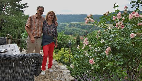 Der Garten lebt von den unterschiedlichen Elementen und dem nahtlosen Übergang in den angrenzenden Wald. Obwohl das Ehepaar erst seit zweieinhalb Jahren hier wohnt, sieht man schon sehr deutlich die Hand der diplomierten Designerin, die den Lebensraum hier gerne mit der Toskana vergleicht. Aufgewachsen in einem Garten kann sie hier ihre Liebe zu den Stauden pflegen. Zu den alten Obstbäumen und den anderen Gehölzen wächst hier eine Vielfalt von unterschiedlichen Pflanzengesellschaften. Ihre besondere Vorliebe gilt den Rosen und deren Begleitstauden wie Frauenmantel, Lavendel und filigranen Gräsern.