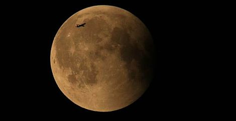 Während der Aufhellungsphase flog ein Flugzeug am Himmel über Neumarkt vor dem Mond vorbei