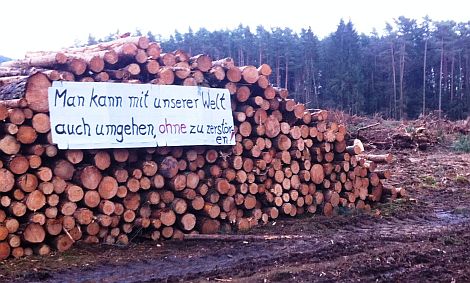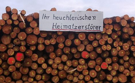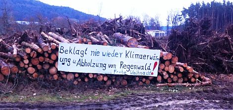 „Frohe Weihnacht“ heißt es ironisch auf einem der riesigen Plakate, die die unbekannten Umweltschützer an die riesigen Haufen von aufgeschichteten Baumstämmen angebracht haben, die der Umgehungsstraße zum Opfer gefallen sind.