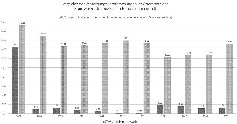 Die Stadtwerke nutzen den Strimausfall, um sich selbst kräftig auf die Schultern zu klopfen: in der Statistik der Bundesnetzagentur zu den Versorgungsunterbrechungen in Deutschland lag man 2017 mit 1,30 Stromausfallminuten je Kunde weit unter dem zuletzt gemessenen Bundesdurchschnitt von 15,14 Minuten. Schaut man auf die vergangenen zehn Jahre, sei die Ausfallzeit sogar noch geringer. Von 2008 bis 2017 waren die Neumarkter Kunden im Durchschnitt lediglich 0,95 Minuten ohne Strom.