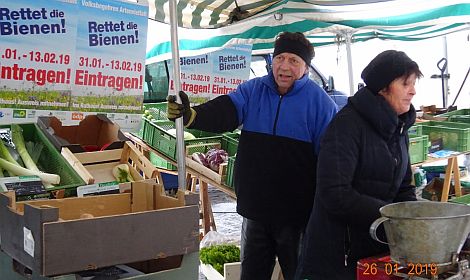 Von den Bio-Bauern hatte Eddie Nowack die Initiative ergriffen und die Gemüsestände mit großen Plakaten versehen. Wenn es nach den Kunden auf dem Bauernmarkt geht, ist das Volksbegehren schon gewonnen.