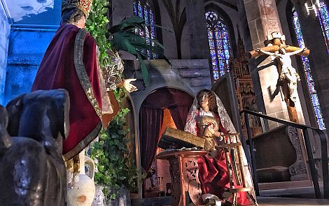 In der Münsterkrippe sitzt die Jungfrau Maria gerade fleissig am Spinnrad und neben ihr liegt aufgeschlagen das Evangelium des Evangelisten Lukas, in dem der Engel Gabriel angekündigt wird.