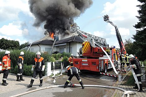 Das am Vormittag entdeckte Feuer in einer Garage hatte rasch auf das Wohnhaus übergegriffen. Die Feuerwehren konnten ein Überspringen der Flammen auf die benachbarte Wohnbebauung verhindern.
