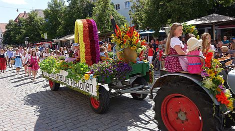 Im Zug zu sehen waren insgesamt 71 Pferde, die in Pferdegruppen oder vor Kutschen und Wagen gespannt mit dabei waren. Außerdem konnten sich die Zuschauer über zwölf Esel freuen und über eine hohe Anzahl bunt geschmückter Wagen. Alleine für die Blumenwagen haben die teilnehmenden Gruppen bei der Stadtgärtnerei in diesem Jahr 56.000 Dahlienblüten, über 800 Gladiolen und 800 Sonnenblumen bestellt, mit denen sie dann zum Teil mit enormem Aufwand schön gestaltete Blumenwagen fabrizierten.