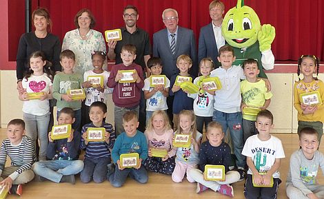 Bürgermeister Albert Löhner überreichte sie zusammen mit AOK-Direktor Gerhard Lindner im Beisein der Konrektorin Julia König und Klassenleiterin Susanne Harrer an die ABC-Schützen der Theo-Betz-Grundschule.